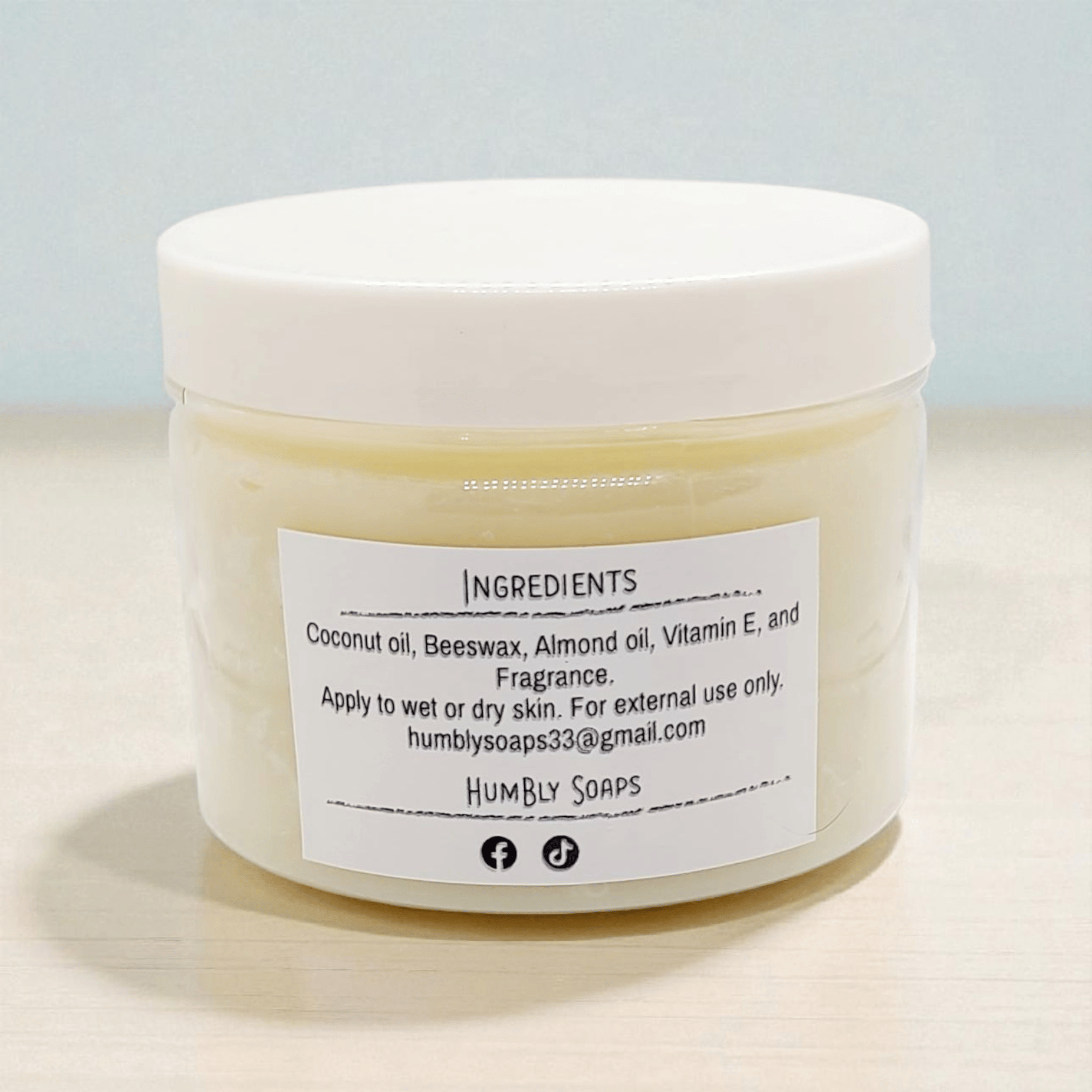 Ingredients: Coconut oil, Beeswax, Sweet almond oil, Vitamin E, and Fragrance.