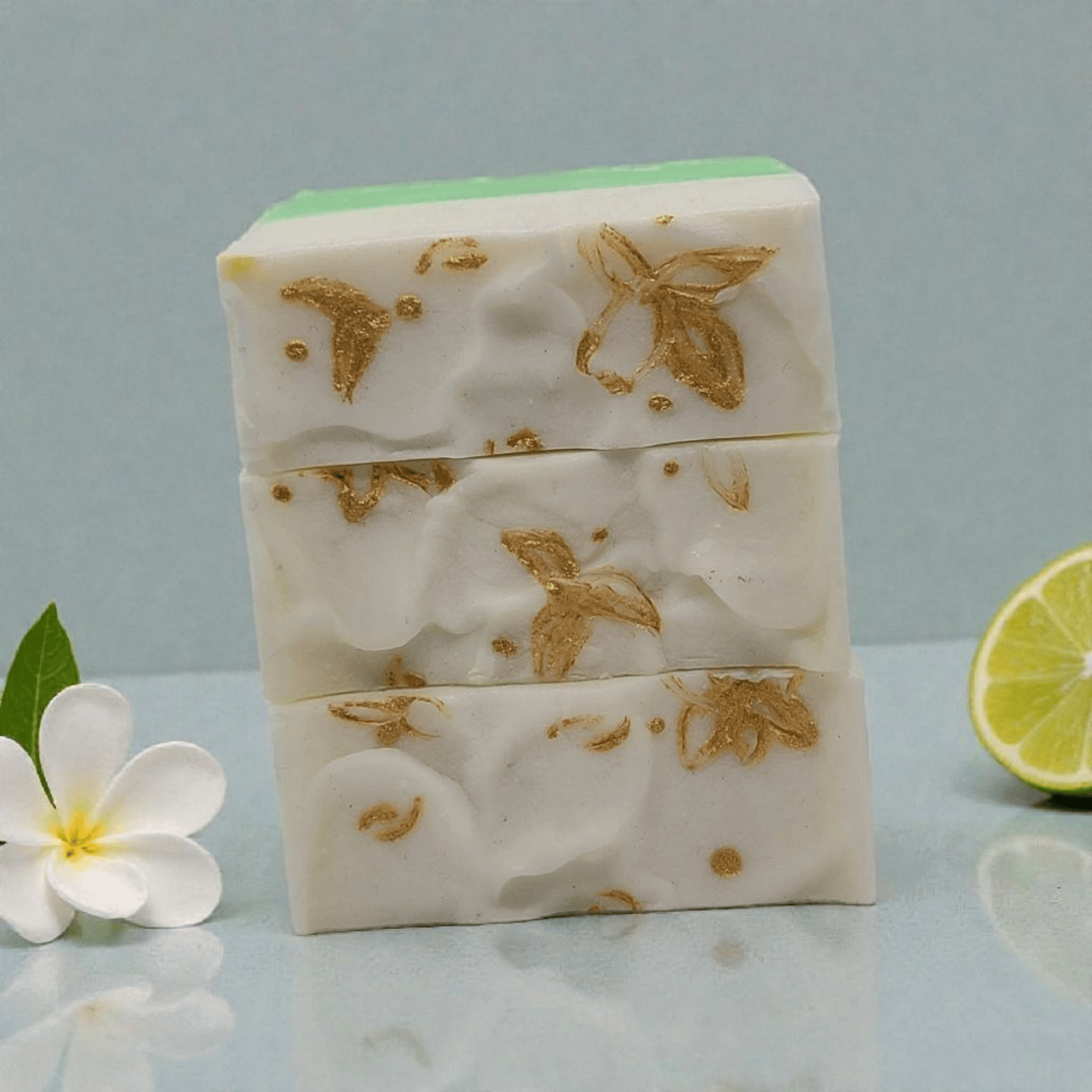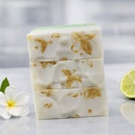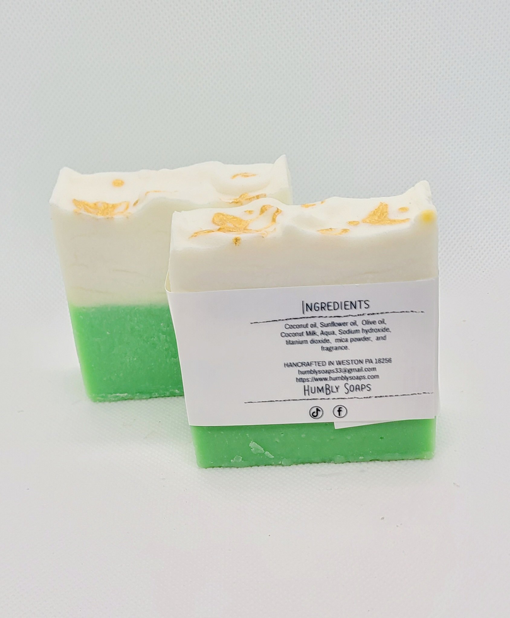 Ingredients: Coconut oil, Sunflower oil, Olive oil, Coconut Milk, Aqua, Sodium hydroxide, Titanium dioxide, Mica powder, and fragrance.