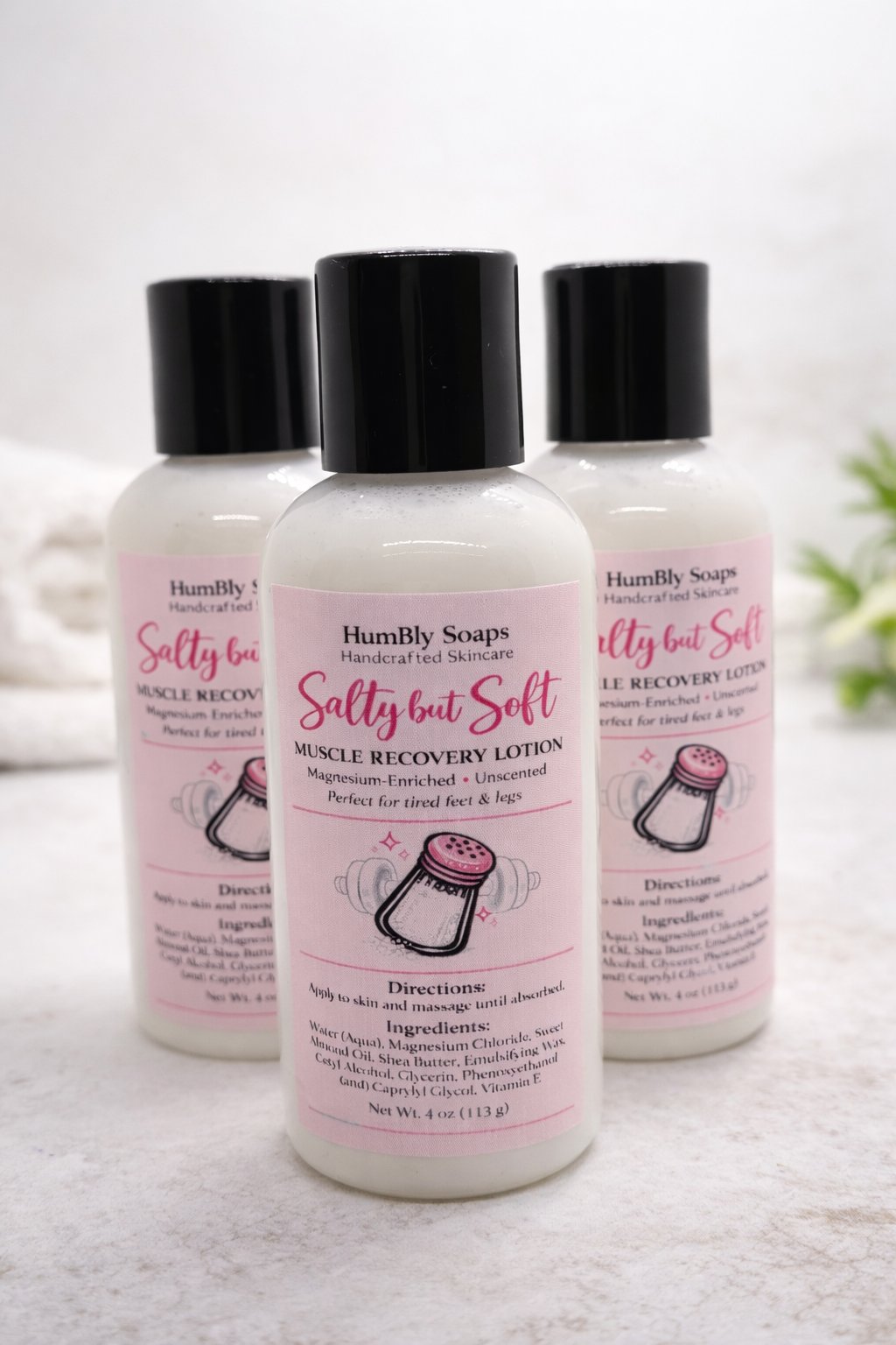 Give your skin the care it deserves with our Salty but Soft Muscle Recovery Lotion, thoughtfully handcrafted by HumBly Soaps. This magnesium-enriched lotion is designed to nourish, hydrate, and provide a soothing self-care experience after long, busy days.