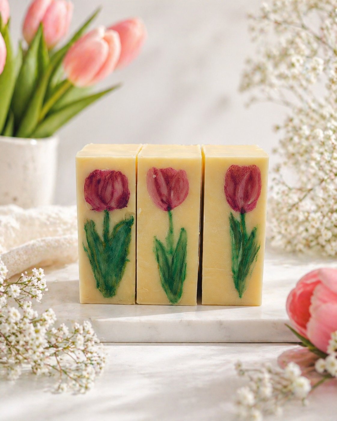 Bring a touch of springtime to your daily routine with our handcrafted Tulip Artisan Soap. Each bar is carefully made and features a delicate, hand-painted tulip design, capturing the beauty of blooming gardens in every slice.
